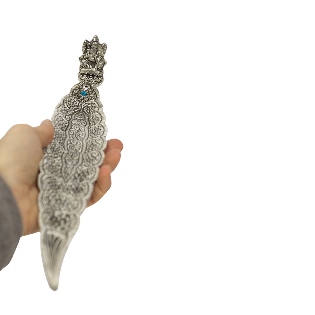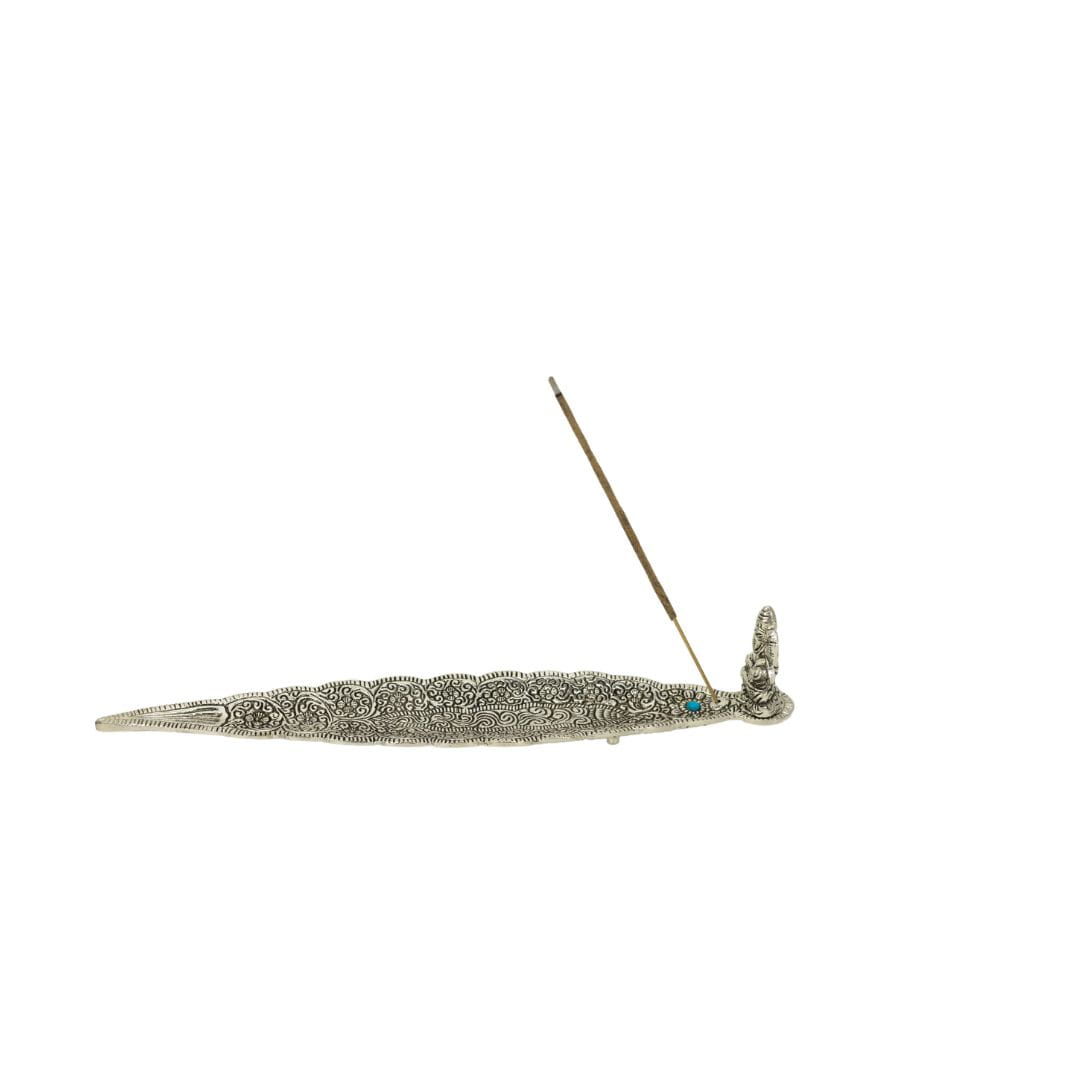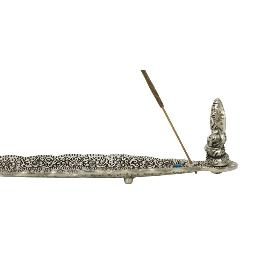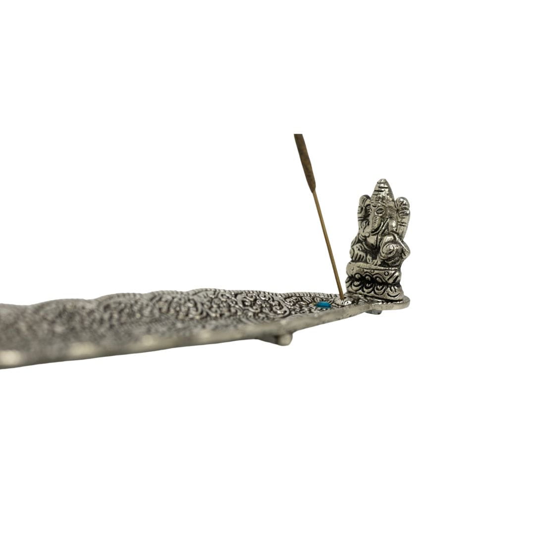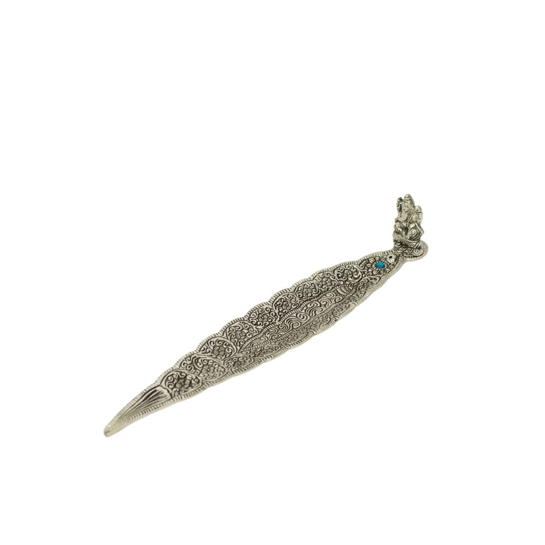 Pięknie wydrążona z wzorami indyjskimi, duża, metalowa podstawka do kadzidełek zapachowych. Na brzegu podstawki siedzi Ganesh Bóg pomyślności.
