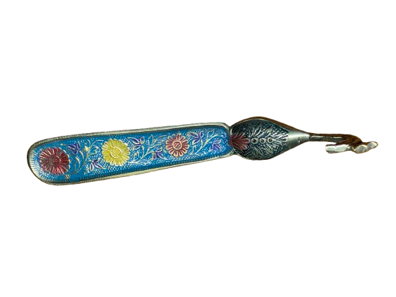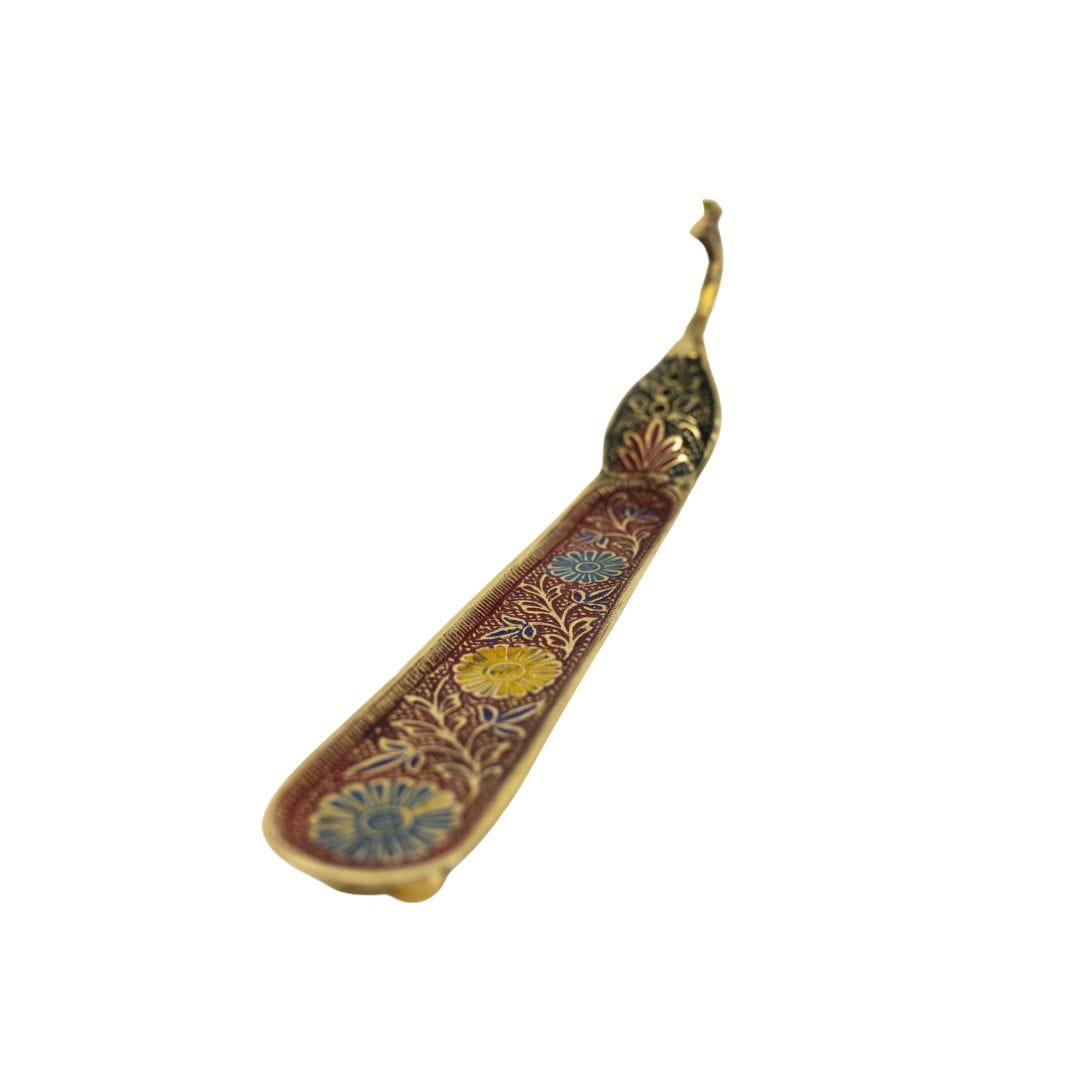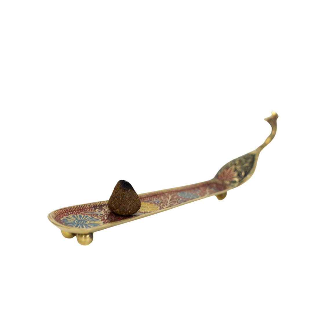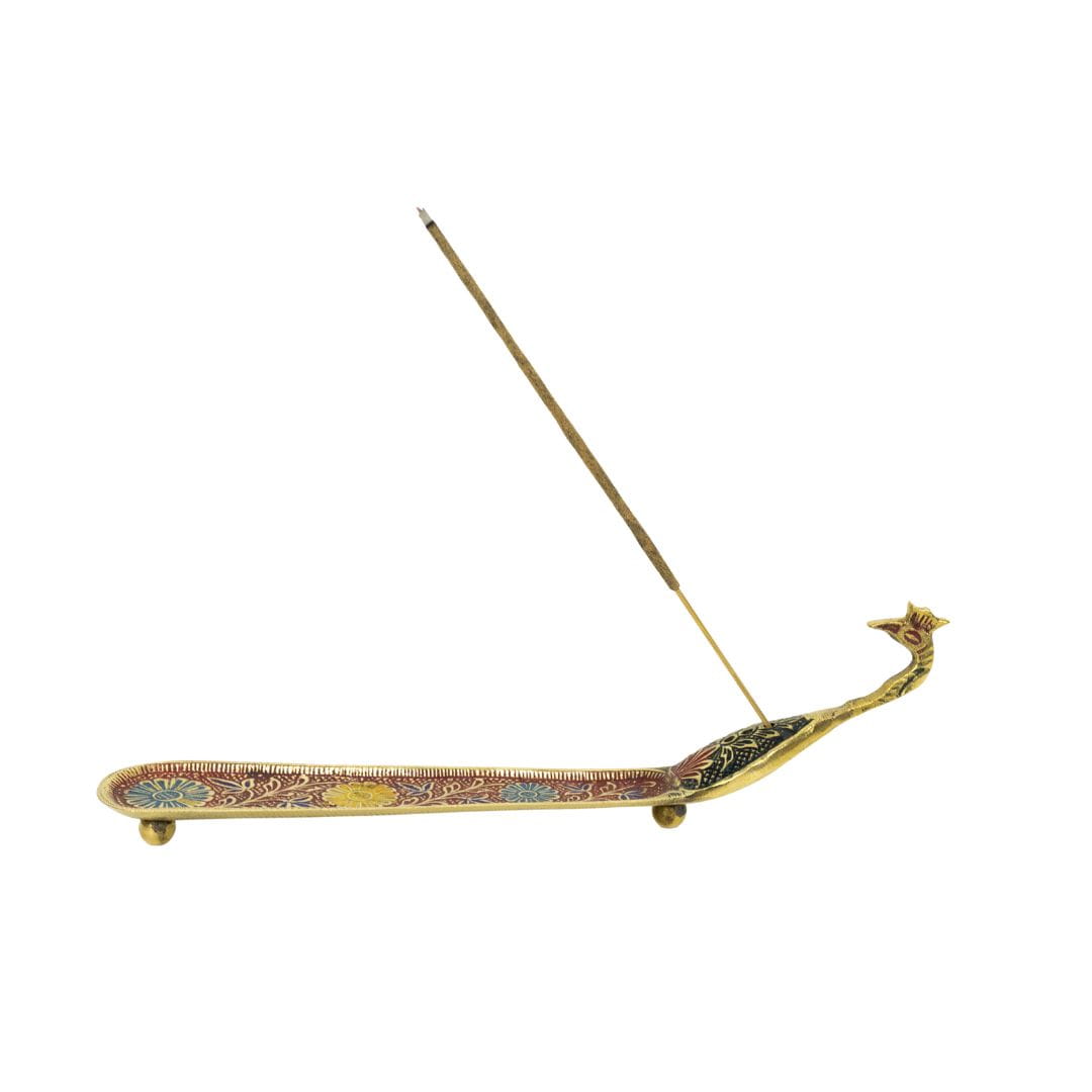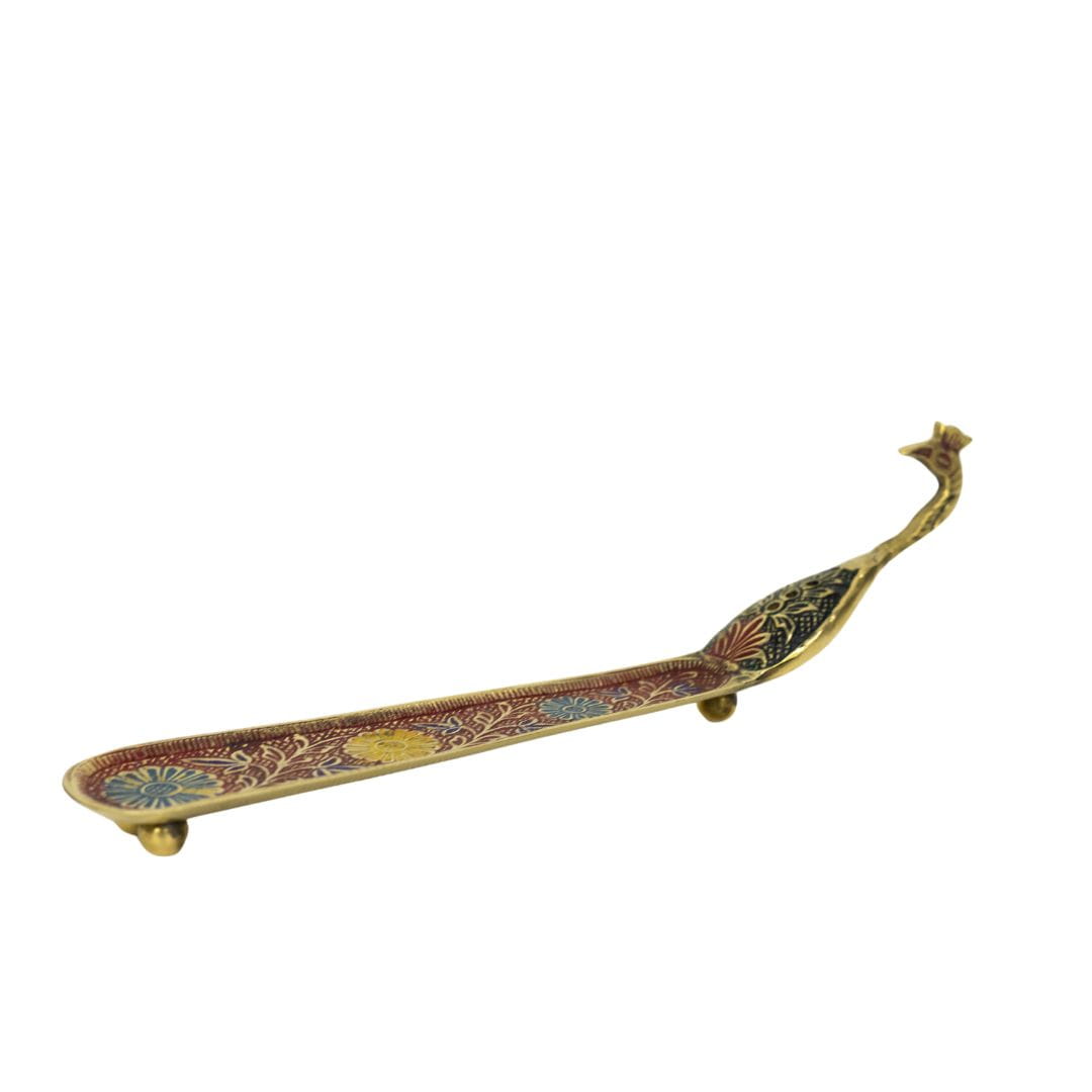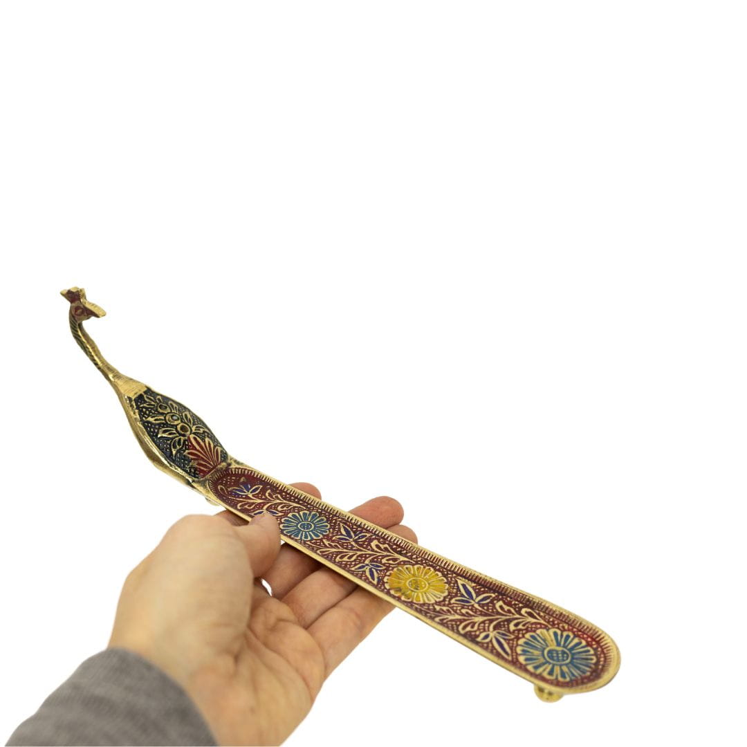 Mosiężny stojak pod kadzidełek zapachowych. Kolorowo pięknie zdobiony paw indyjski.