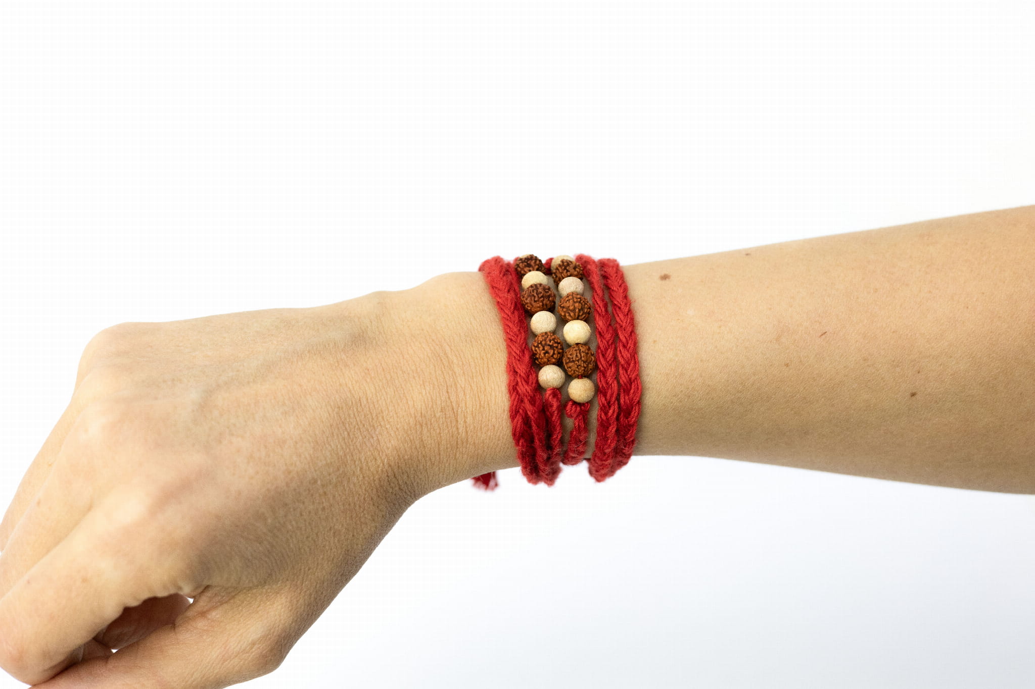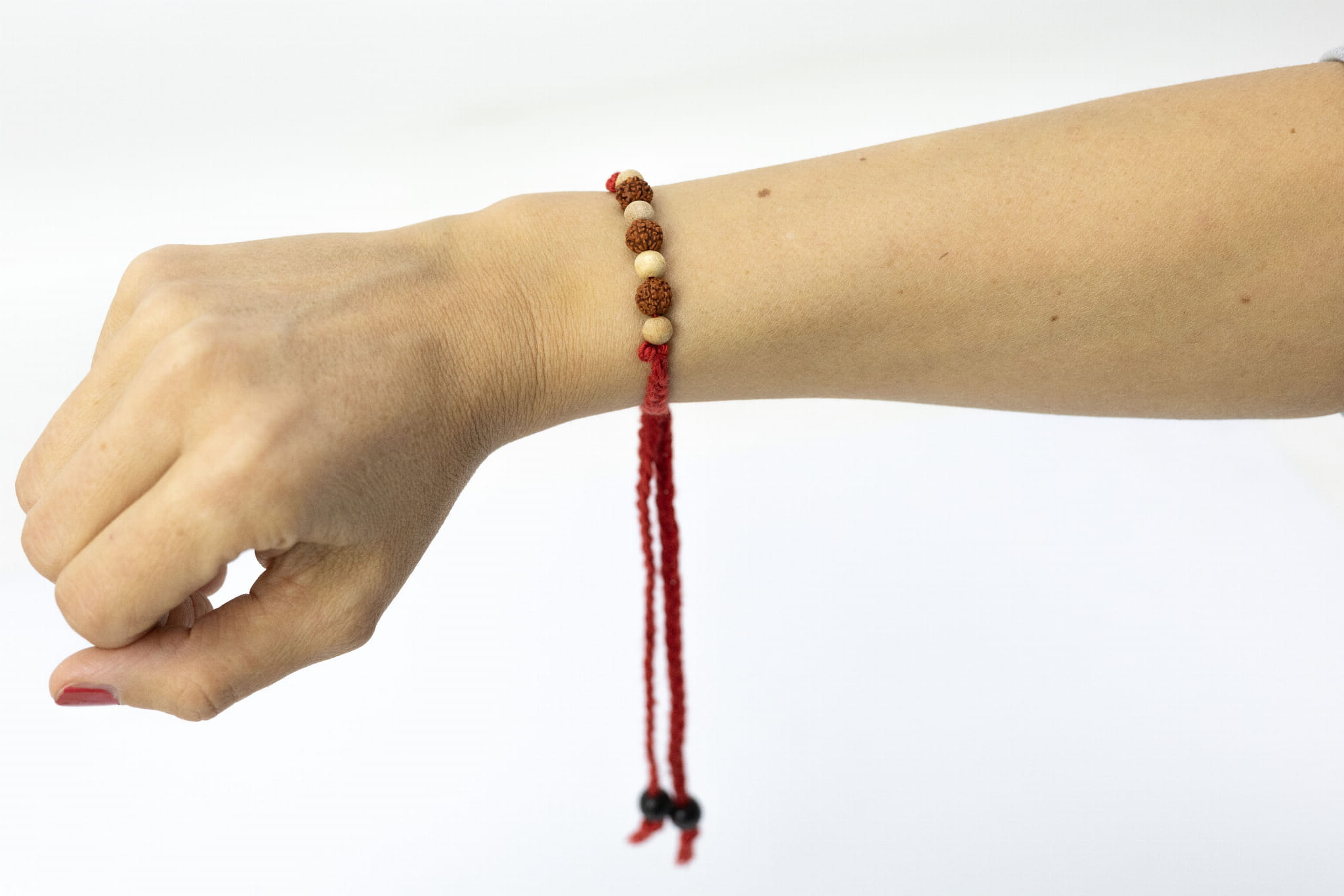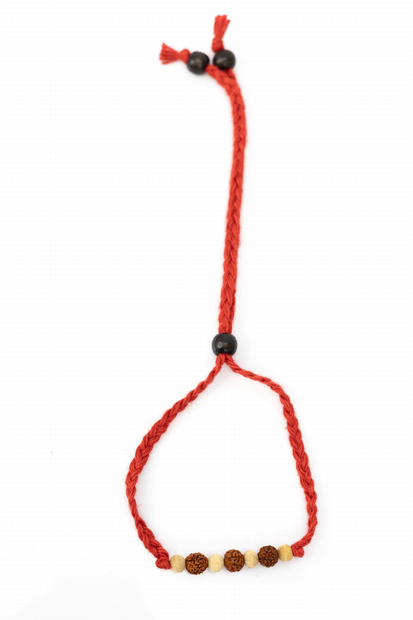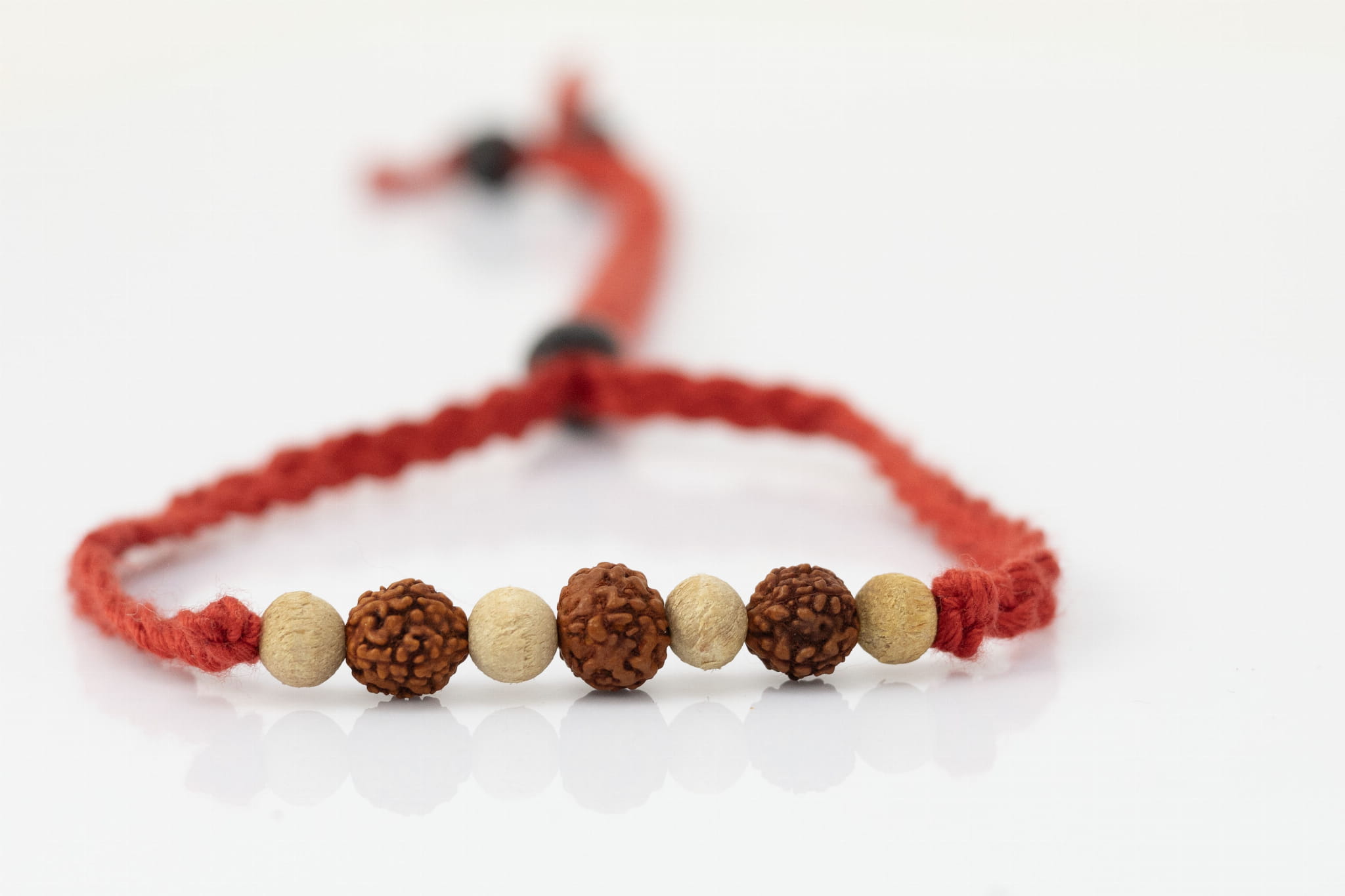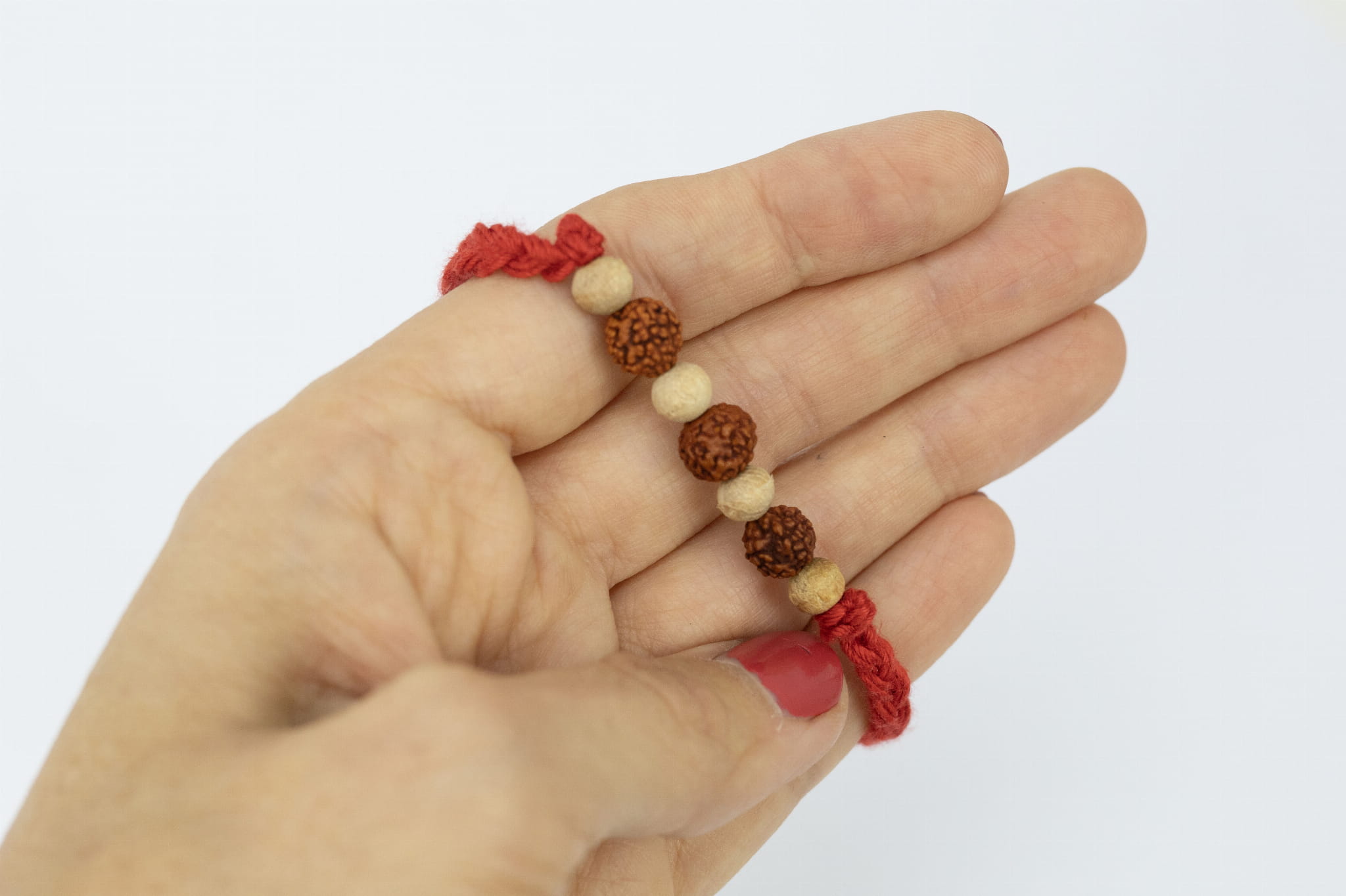Ręcznie robiona bransoletka z małych koralików Rudraksha 5 Mukhi i 4 pomarańczowymi drewnianymi koralikami. Bransoletka jest nawleczona na bawełnianą nitkę z 3 drewnianymi koralikami i można je regulować.