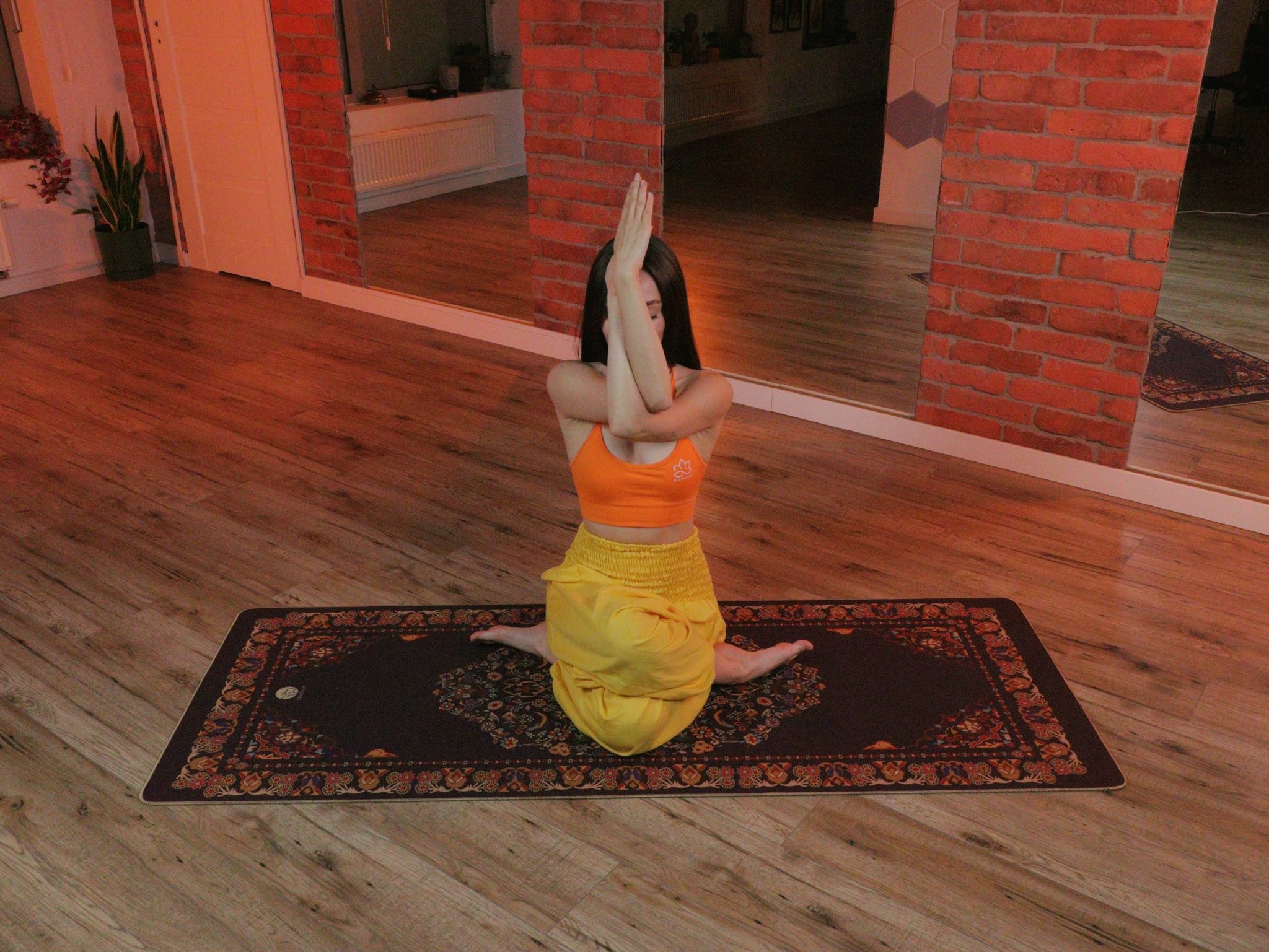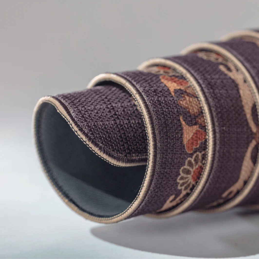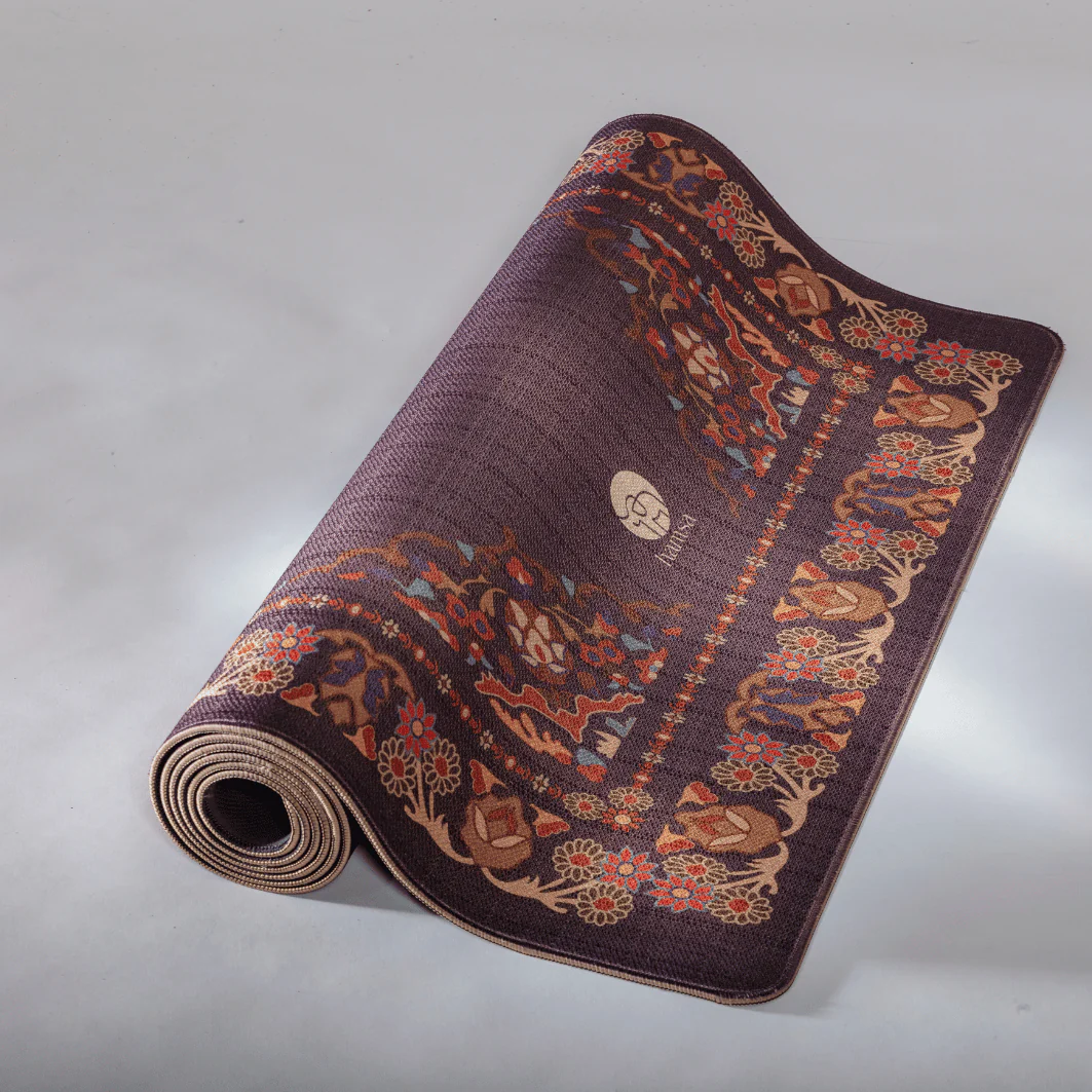 Fioletowy kolor i orientalny wzór wspierają skupienie, wyciszenie i duchową stronę praktyki.